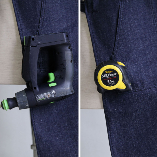 ただ、私の作業場所はあまり広くなく、メジャーなどもすぐ手が届く範囲にあるためポケットは使っていません。普段もポケットにあ