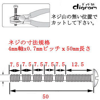 取っ手 つまみ用 カット長さ調整可能ネジ / 4mm軸x0.7ピッチ x 50mm長さ 【00436】