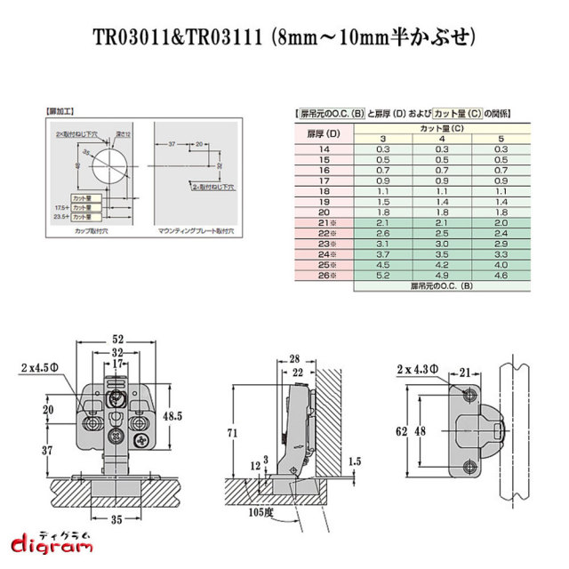3D スライド 丁番 ダンパー内蔵 脱着式 キャッチ付き 35φ ( 半かぶせ ) 10個セット 【TR03111】